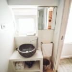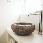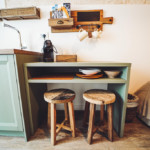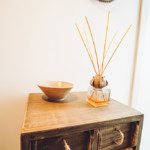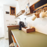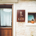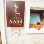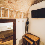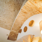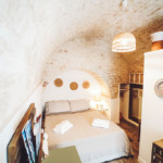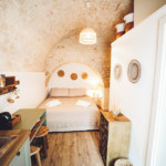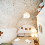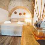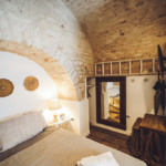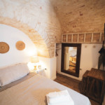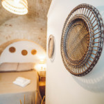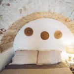 Oggetti in legno e cestini in vimini adornano le pareti bianche, abat jour e lampade dalle forme particolari proiettano ombre suggestive sui muri di pietra, parquet e mobili dalle tinte calde riscaldano il piccolo e accogliente “Trullo Syrah”.